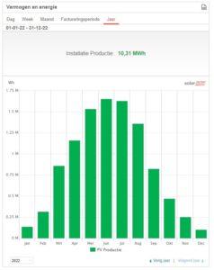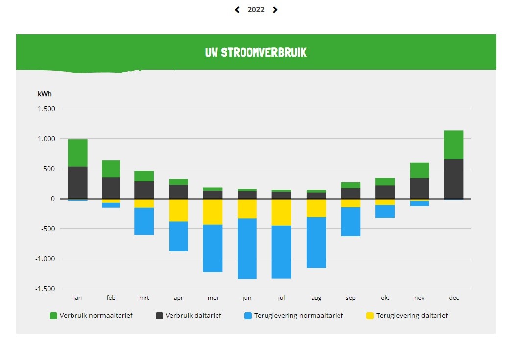 • Over het gehele jaar 2022 hebben we 5500 kwh van het net afgenomen en 7700 kWh terug geleverd. Een positief resultaat van 2200 kWh.