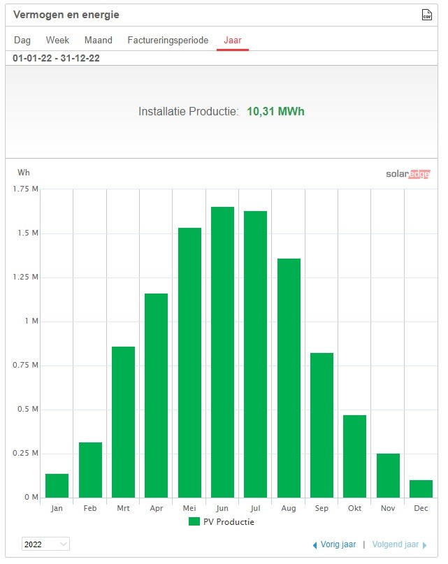 • De totale opbrengst van de PV over 2022 bedroeg 10,2 mWh. Deels hebben we dit voor de meter benut en deels teruggeleverd.