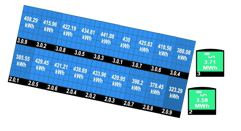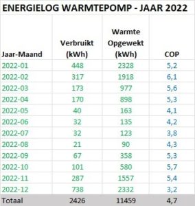 • De PV opbrengst van de 10 PVT-panelen bedroeg in 2022 ongeveer 3020 kWh. Het verbruik van de WP bedroeg 2426 kWh. Het verbruik van de WP wordt door ruimschoots gecompenseerd door de PV opbrengst van alleen de PVT-panelen.
