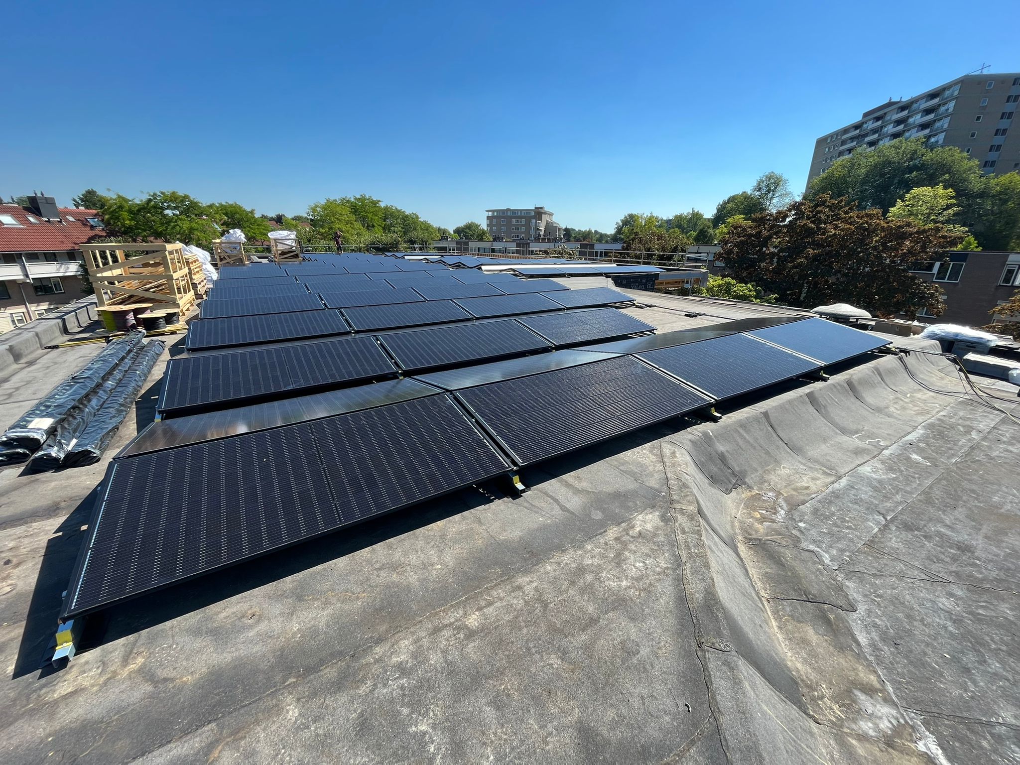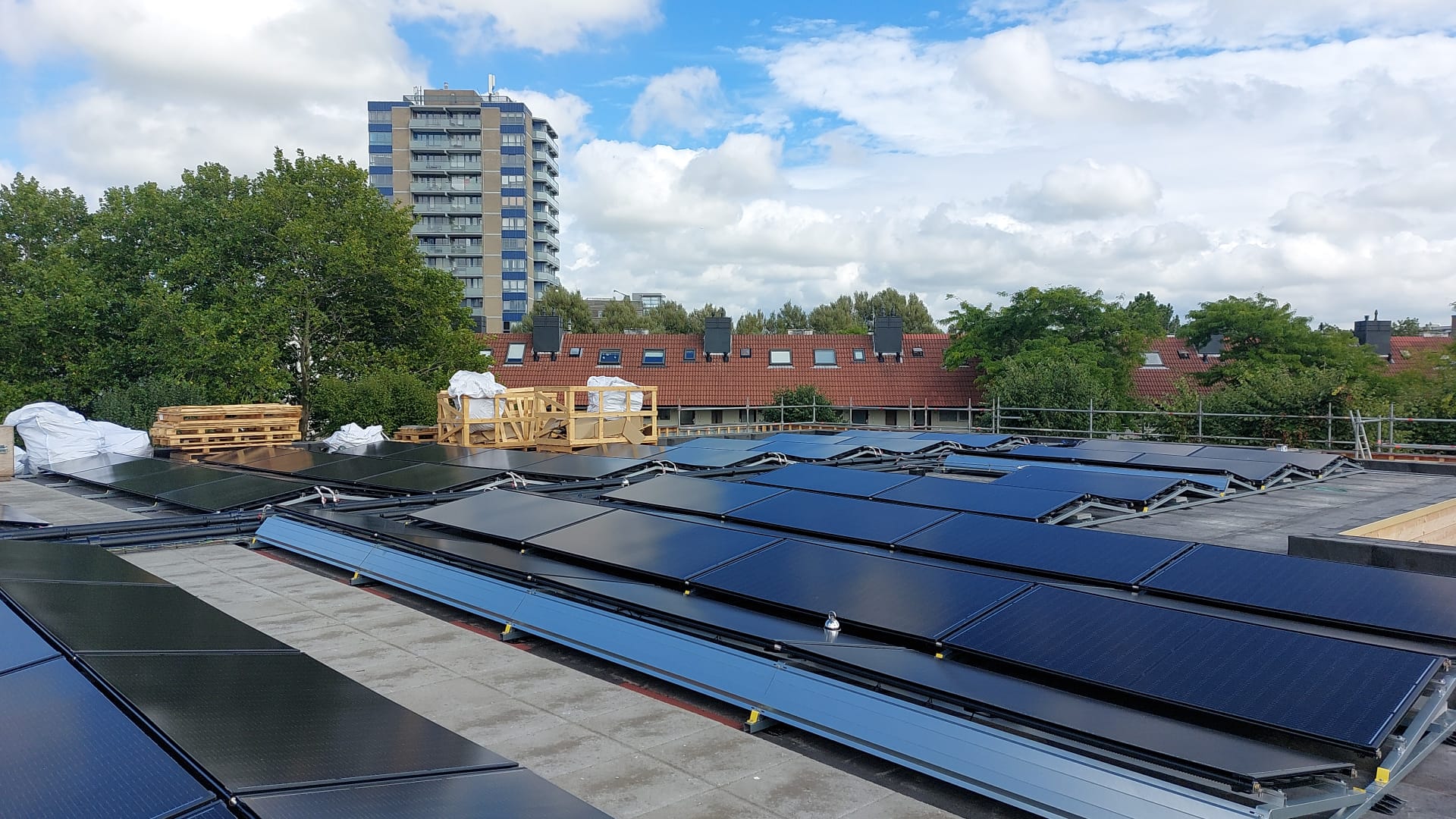 Basisschool De Wijde Wereld in de Haarlemse Schalkwijk is circulair gerenoveerd en klaar voor de toekomst. Het schoolgebouw was er niet goed aan toe. Renovatie was dan ook geen voor de hand liggende optie. Maar dankzij een innovatieve, circulaire gevel blijft de school behouden. Het gebouw krijgt een nieuwe buitenkant op basis van een Fins houtbouwsysteem. Ook is het gebouw gasloos en wordt nu verwarmd door twee 53,4 kw warmtepompen gekoppeld aan 130 Triple Solar PVT-warmtepomppanelen 450 Wp (2,13 x 1,055 m).