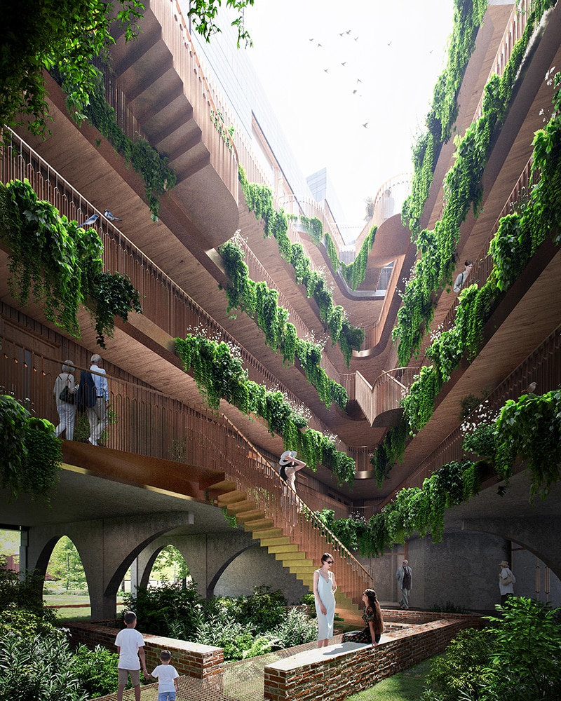 Bewoners hebben toegang tot collectieve voorzieningen in de entree en de groene binnentuin. Dit stimuleert ontmoeting en sociale interactie. Het gebouw is circulair en demontabel ontworpen.