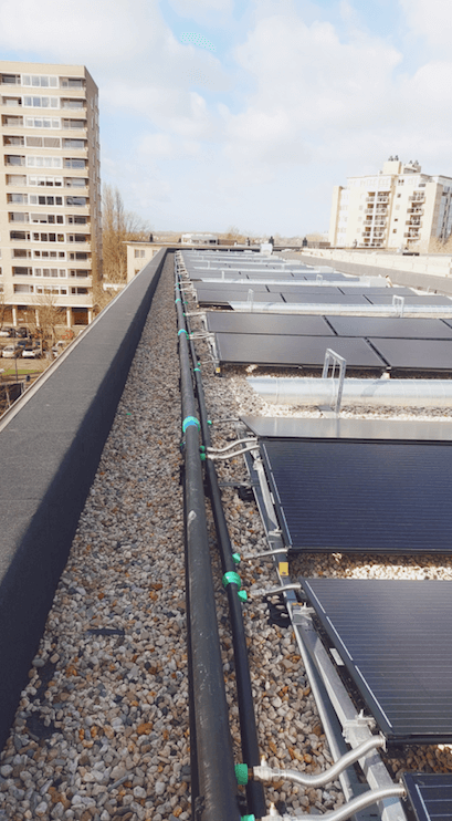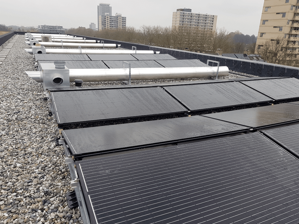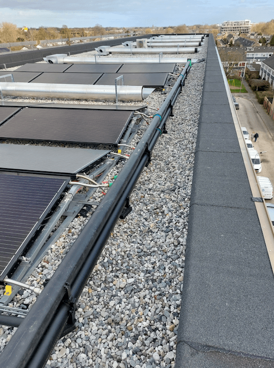 In opdracht van Dura Vermeer hebben we 120 PVT-panelen geplaatst. Het gebouw wordt circulair gebouwd en volledig gasloos uitgevoerd, voorzien van een WKO-installatie en Triple Solar PVT-panelen met extra zonnepanelen. De warmtepomp is van Ecoforest (ecoGEO HP1-25-100kw).