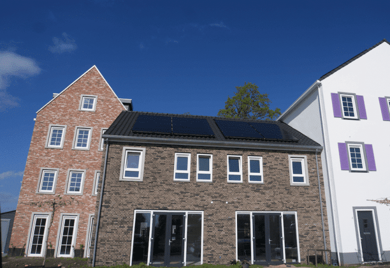 Hierboven een voorbeeld van een bouwblok met Triple Solar PVT-warmtepomppanelen in de nieuwbouwwijk De Draai in Heerhugowaard. De middelste woningen hebben 10 PVT-warmtepomppanelen, aangevuld met 2 PV-panelen. Tussen de vlakken zijn aluminium afdekkappen over het leidingwerk gemonteerd voor een strakke afwerking.