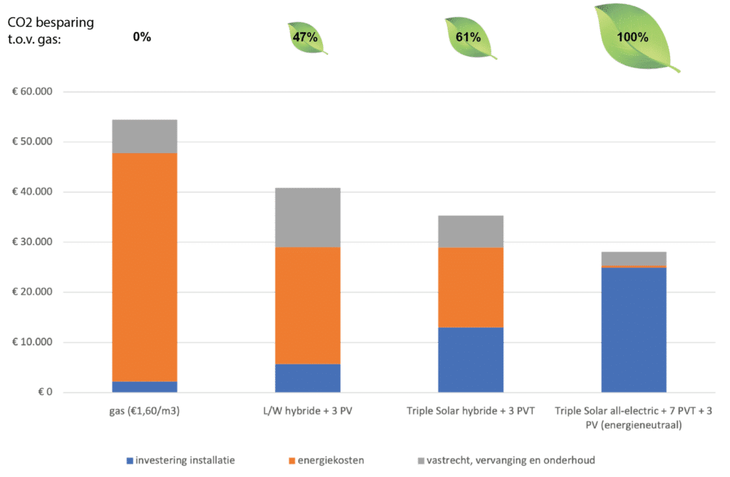 Voor de opdrachtgever geldt dat de investering in de hoogwaardige en duurzame Triple Solar-installatie veelal wat hoger is dan in een lucht/water-warmtepomp (met een vergelijkbare hoeveelheid PV-panelen), maar dat de TCO lager is.