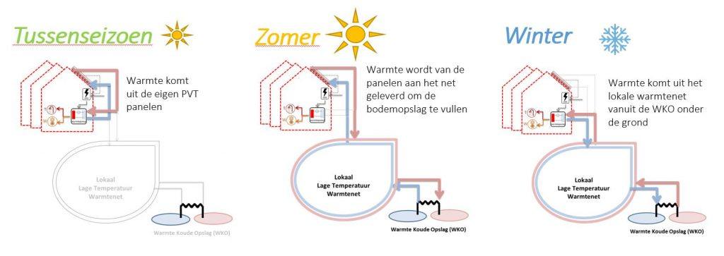 Een speciale ‘afleverset’ – een kastje met leidingen, pompjes en kleppen – zorgt ervoor dat de warmte van het warmtenet en de PVT-panelen optimaal benut wordt. In de zomer wordt alle overtollige warmte van de PVT-panelen via het netwerk in de ondergrondse opslag opgeslagen. In de tussenseizoenen wordt de warmte door de PVT-panelen aan de warmtepomp geleverd. In de winter wordt de warmte hoofdzakelijk uit de warmtekoudeopslag geleverd, waardoor de warmtepomp een extra hoog rendement kan halen.